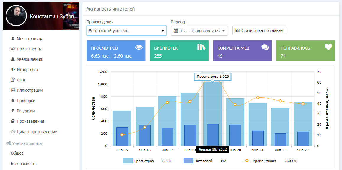 По итогу недели: на максимуме, в день с большим количеством бесплатных постов 66.09 часов чтения. На минимуме 38.69