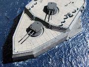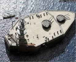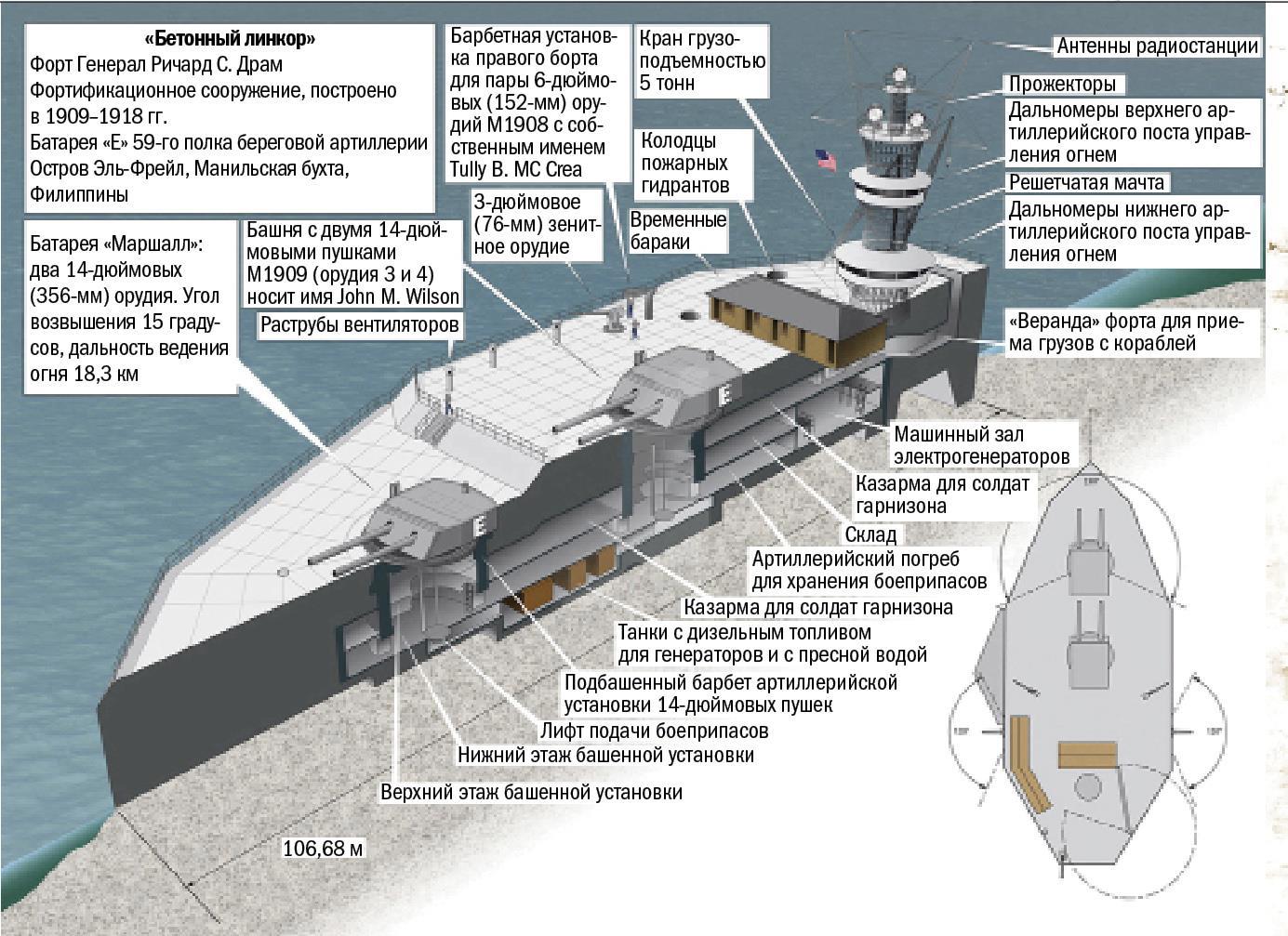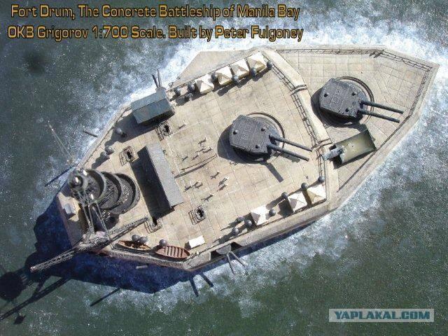 В 1898-м году Американцы захватили Филиппины у Испанцев, и тут же занялись береговой обороной входов в Манильский залив. Фортифицировались оба берега и большой остров Коррехидор. На них всех строились стандартные для Американцев в то время открытые пушечные и мортирные батареи. Однако этого было сочтено недостаточно, и один небольшой остров (точнее скала торчащая из воды) на другом конце входа в пролив был срезан до уровня моря и на нем был построен бетонный массив в форме передней половины большого боевого корабля.
