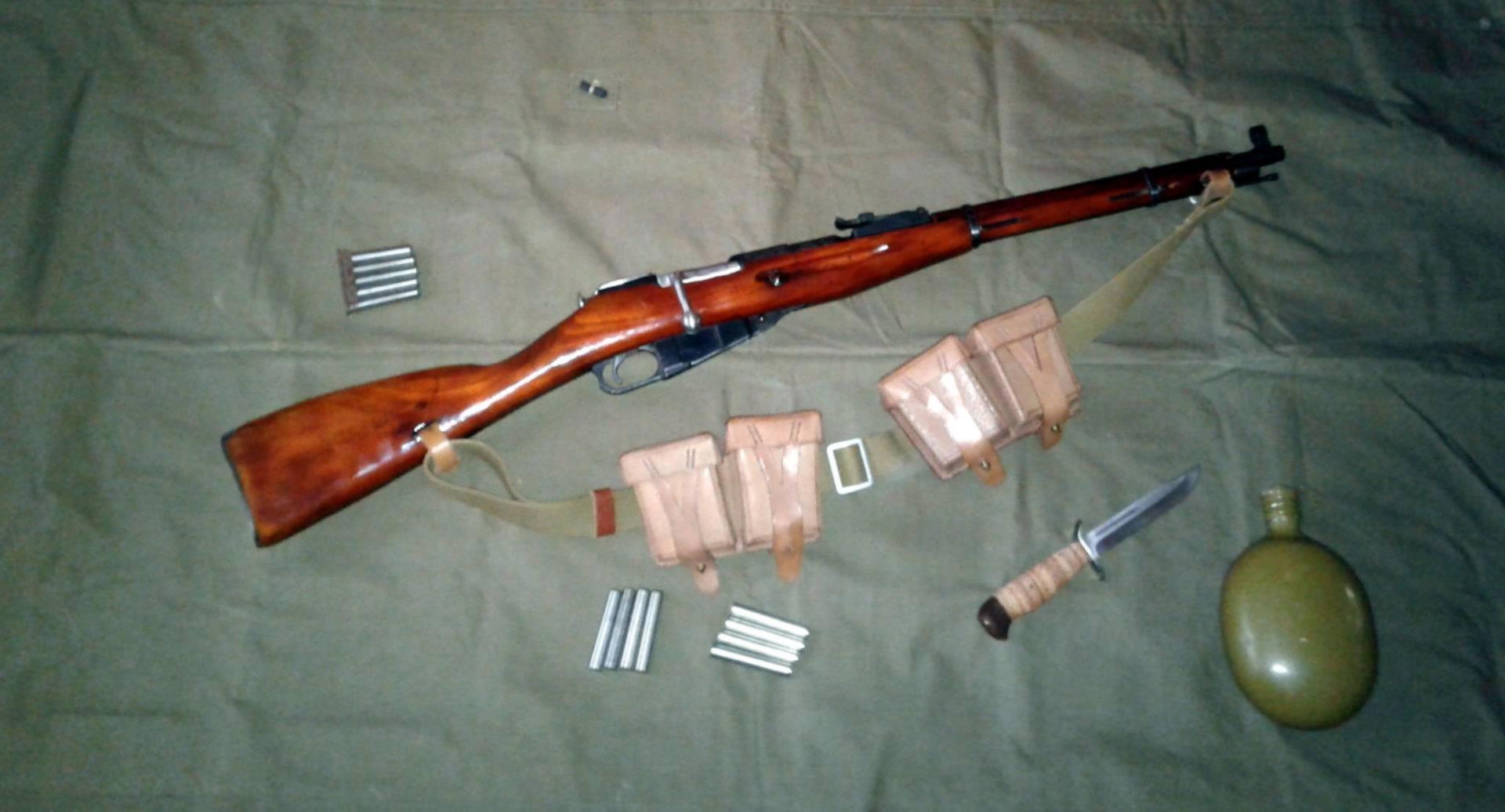 Муфлон 410 с патронами - переделка нарезного карабина МОсина в гладкоствол. Еще на фото финка и фляга.