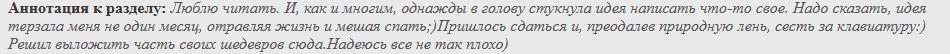 Писать я начал на втором-третьем курсе ВУЗа, когда открыл для себя Самиздат и, видя что там пишут не "специально обученные люди", а практически кто угодно, загорелся желанием начать сам. К слову, аннотацию к разделу я как написал, так и не менял: