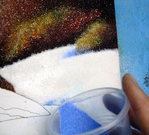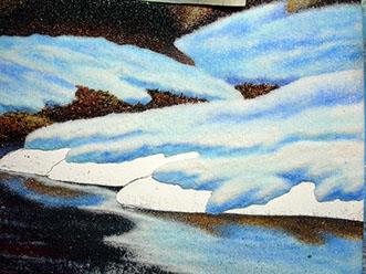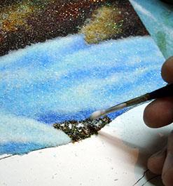 Творчество художника восхищает и привлекает. Все картины Алексея выполнены из разноцветной каменной крошки, без подрисовок, за исключением неба и воды (частично), которые Алексей рисует аэрографом по крошке."