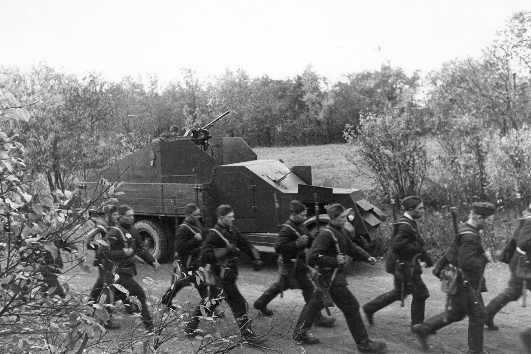 1941 год. Ополченцы вместе с самодельным бронированным грузовиком идут на фронт