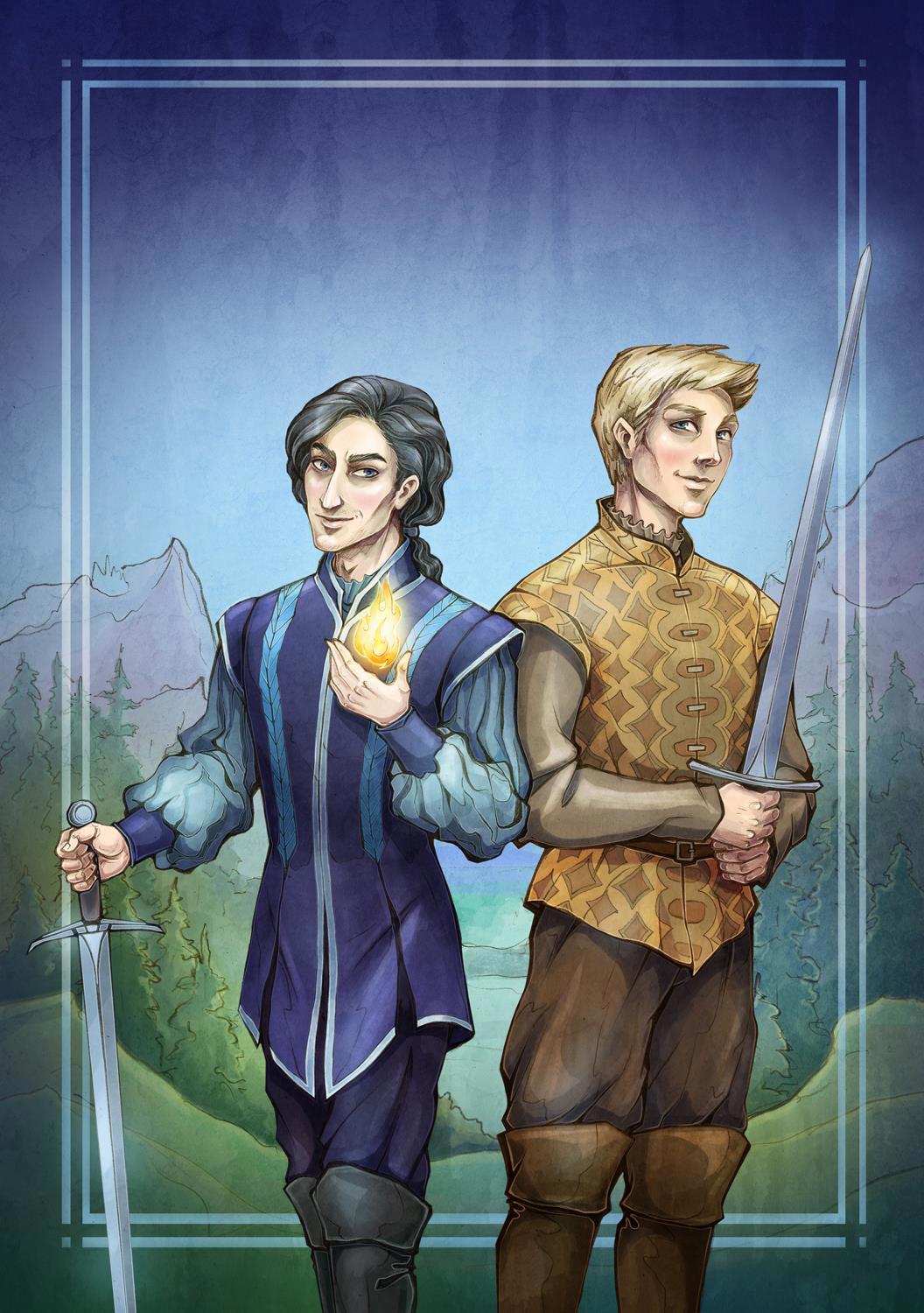 Автор: TanmornaИллюстрация для обложки книги Эйке Шнайдер с фактурными парнягами и усиленной эпичностью! Скалистый пейзаж с лесом, мужики с бликующими мечами, костюмы в рисовании которых я отталкивалась от классных референсов автора - прям все сошлось. Сижу теперь довольная проделанной работой и, кстати, принимаю новые заказы!