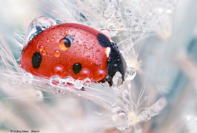 Божья коровка среди хрустальных капель