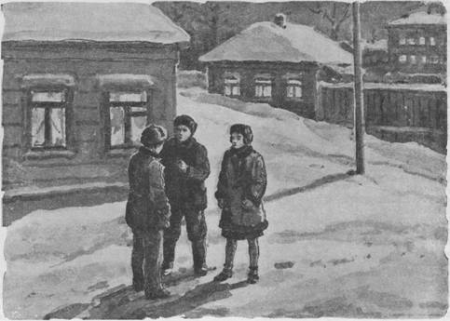 Расстроенный стычкой с классом Саша пропускает урок физики и пионерский сбор (они с товарищем только что назначены вожатыми у младших пионеров, и в тот самый день как раз должны были провести с ними первое занятие и рассказать о том, как в Америке убивают негров. Нет, я не шучу. Вся эта презентация про «маленького негритенка Сэма, отца которого в Алабаме повесили за то, что он черный» в тексте описана очень подробно). В результате – во дворе на Сашу набрасывается его одноклассница и лучшая подруга Юлька, которая начинает его колотить. Школьники сперва кричат и улюлюкают, что Саша трус, потому что он не хочет драться с девочкой. А когда он все-таки толкает Юльку, и та падает в сугроб, те же самые люди реагируют на это так – «Емельянов ни за что ни про что исколотил Юлю. Мы отплатим ему, он узнает!». К счастью, Юлька справедливо возражает, что она сама его исколотила.