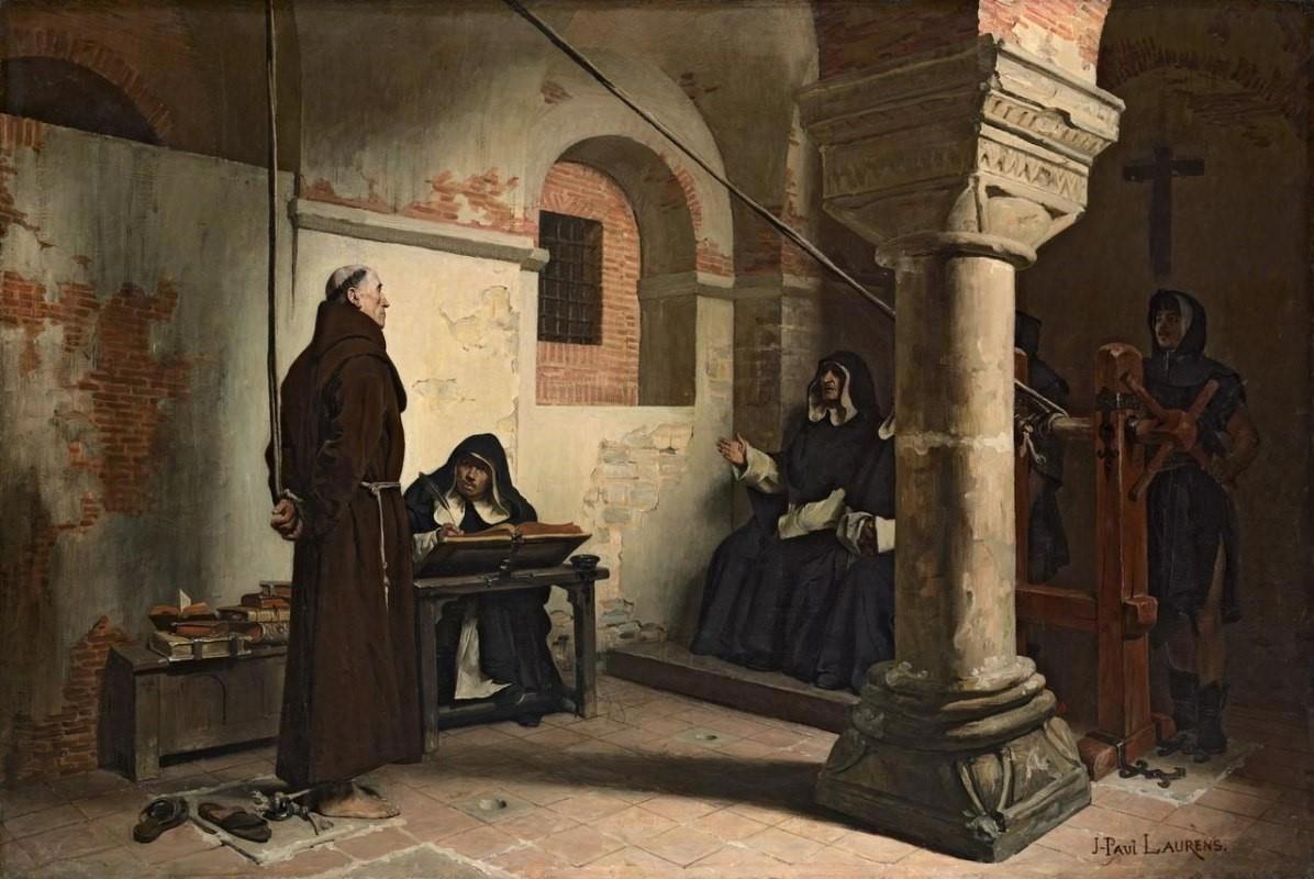 картина Жана-Поля Лоранса «Бернар Делисье в трибунале инквизиции", 1881г. - очень достоверное изображение. Если вы удивились, чего это собрались пытать монаха - он может колдун?, так вовсе нет. Францисканец Бернар Делисье пошел против "своих", выступав против методов работы Инквизиции и пытаясь добиться улучшения условий содержания еретиков - катарских верующих и Добрых Людей в муре Каркассона. В итоге его осудили на "тесный мур" в этой же тюрьме Каркассона. История эта случилось в 13м веке.