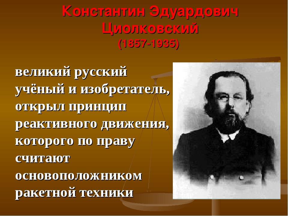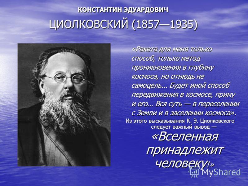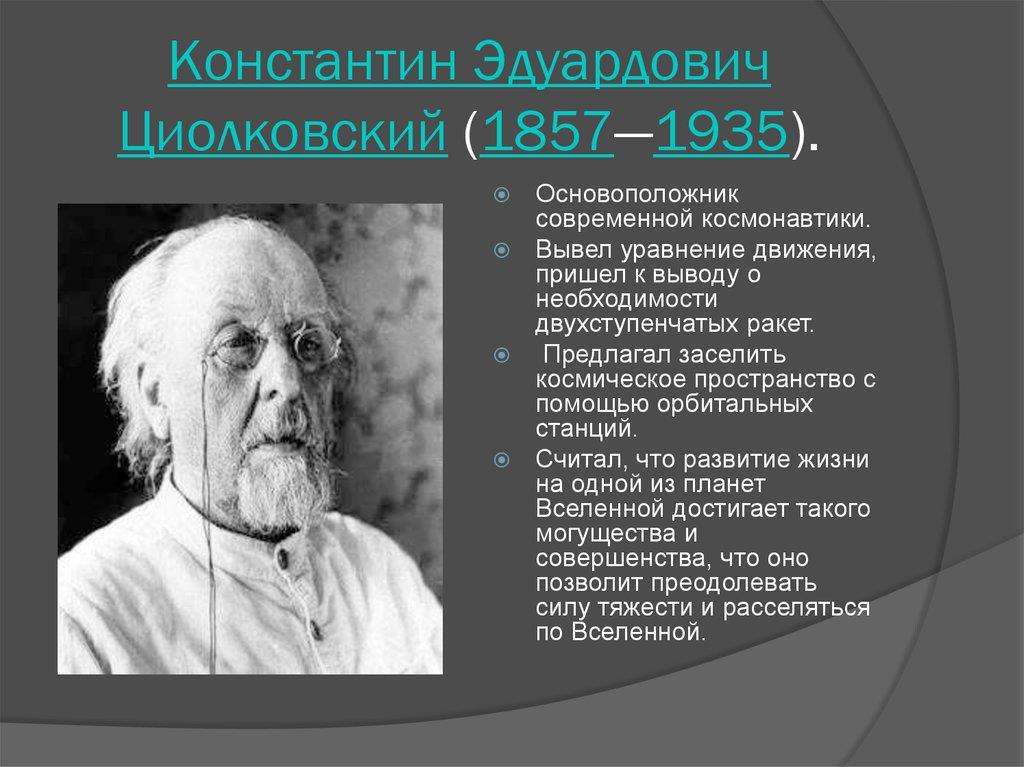 Константи́н Эдуа́рдович Циолко́вский (5 сентября 1857, Ижевское, Рязанская губерния — 19 сентября 1935, Калуга) — русский и советский учёный-автодидакт, разрабатывавший теоретические вопросы космонавтики, и мыслитель эзотерической ориентации, занимавшийся философскими проблемами освоения космоса.