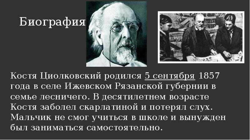 Происходил из шляхетского рода герба Ястржембец. Почти полностью оглохнув в детстве в результате скарлатины, Циолковский не получил систематического образования (проучился четыре года в Вятской гимназии и три года занимался самообразованием). В 1879 году сдал экзамен на звание народного учителя и до 1921 года преподавал математику и физику в училищах Боровска и Калуги, параллельно пытаясь заинтересовать научное сообщество своими проектами аэропланов и цельнометаллического дирижабля, а впоследствии — и ракетной техники. Опубликовал за свой счёт множество трудов, в том числе посвящённых обоснованию идеи космического пантеизма.