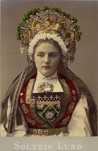 Это - венец невесты (brudekronen). Существует несколько его разновидностей - в виде небольшой короны, в виде большой короны, в форме кокошника и плоский, покрывающий голову и плечи. Девушки из богатых семей, само собой, шли под золотой или серебряный венец, из менее состоятельных возлагали на голову корону из позолоченной (посеребренной) меди или олова, в бедных домах накануне свадьбы плели диадему из соломки. Но цветы, ленты и подвески (звон которых призван отгонять злых духов и отводить недобрые взгляды) полагались каждой невесте. В таком роскошном уборе девушка шла в церковь, в нем же плясала, после обряда бракосочетания, на свадьбе. Плясать полагалось до тех пор, пока венец не свалится с головы. Это был знак, что пир закончился и началась жизнь новой семьи. А упавший венец поднимали и укладывали в сундук, чтобы передать потом старщей дочери, а от нее - старшей внучке и так до тех пор, пока продолжается род.