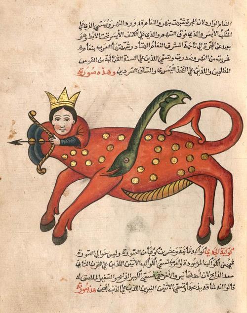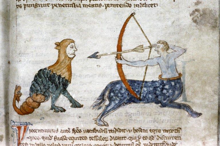 Кентавр стреляет из лука в гротескное существо. Рукопись Бодлеянской библиотеки (MS Douce 88, fol.115r.)