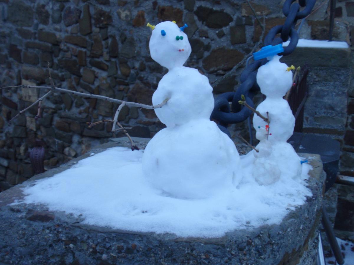 Три из снега вылепленных друга у цепей подъемного моста.
