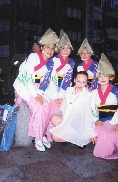 Я смотрела на, казалось, бесконечный цветной поток. Вторя ритму танцовщики выкрикивали слова неведомого им самим заклинания, смысл которого давным-давно утерян. И, о чудо! среди маленьких японцев танцевали европейского вида женщины — из тех, что живут и работают в Японии много лет.