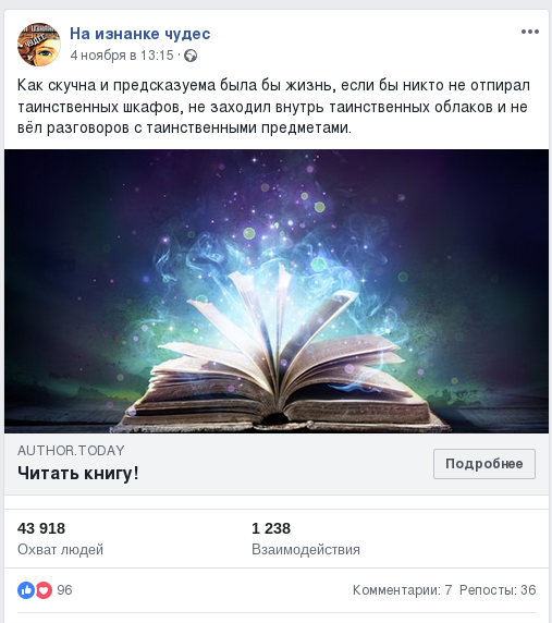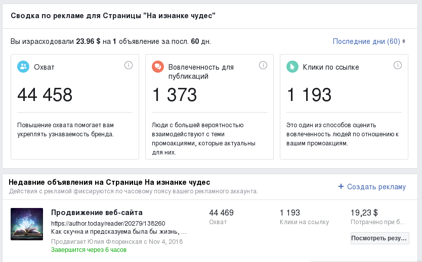 В общем, решила я перенять эстафету просадить денежки на рекламу в фэйсбуке. Реклама ВК была опробована давно. Там я, правда, пиарила не книгу, а группу. И то ли пиарщик из меня никудышный, то ли вконтактовские алгоритмы странные, ожидаемого результата эта затея не принесла.