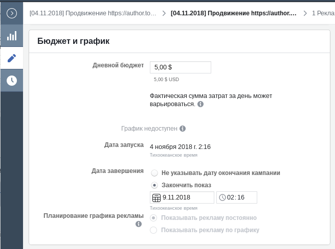 Для начала ограничилась пятью днями, хотя там советовали выбрать неограниченный срок показов. Пять дней - и каждый день из моего кошелька должно было утекать по 5 баксов. Терпимо.