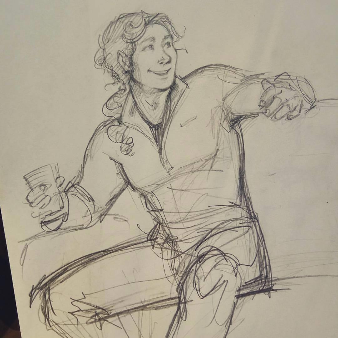 Со славных времен увлечения литературным творчеством остались мегабайты буков, но читабельных фрагментов не так уж много: несколько описаний внешности и характеров. Это, например, посвящено замечательному парняге по имени Рейдон. Написала его мой соавтор, а я нарисовала неповторимого рыжего музыканта в его наиболее естественном состоянии - улыбающимся)