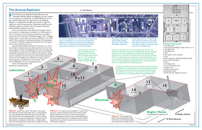 Современная реконструкция взрыва, взято с сайта https://www.lawrencevillehistoricalsociety.org/arsenal-explosion_1862/ картинку в большем разрешении можно посмотреть здесь: http://lawrencevillehistoricalsociety.org/wp-content/uploads/Arsenal_explosion-spread_web.jpg
