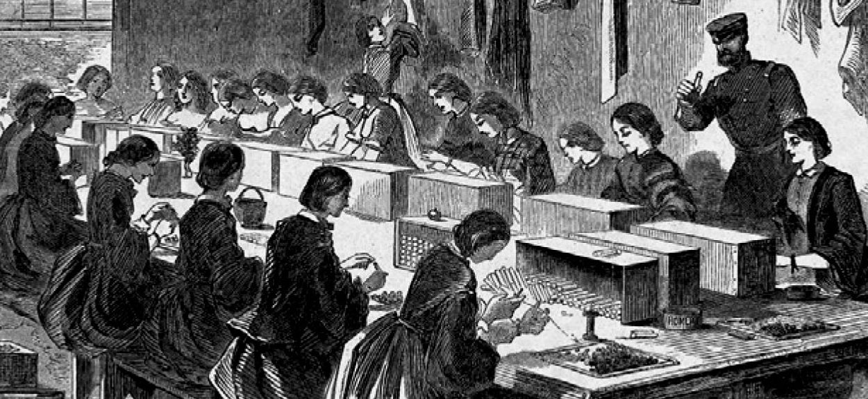 "Пороховые девушки". На картинке из Harper's Weekly, июль 1861 года, правда, изображен Арсенал Уотертауна в Массачусетсе, но организация работы в таких лабораториях была приблизительно одинаковой