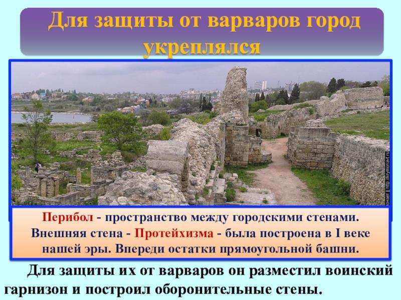 Вот Херсонская крепость, перибол между внешней и внутренней стеной - ловушка, в которую попадает враг, прорвавшись за внешнюю стену. Только стены Херсонеса были сложены из камня и внутренняя возвышалась над внешней. Так действительно удобней в плане обороны, НО: в нашем случае ключевым моментом является то, что внутреннюю стену не зажгли зажигательными снарядами. А потому она должна быть ниже: