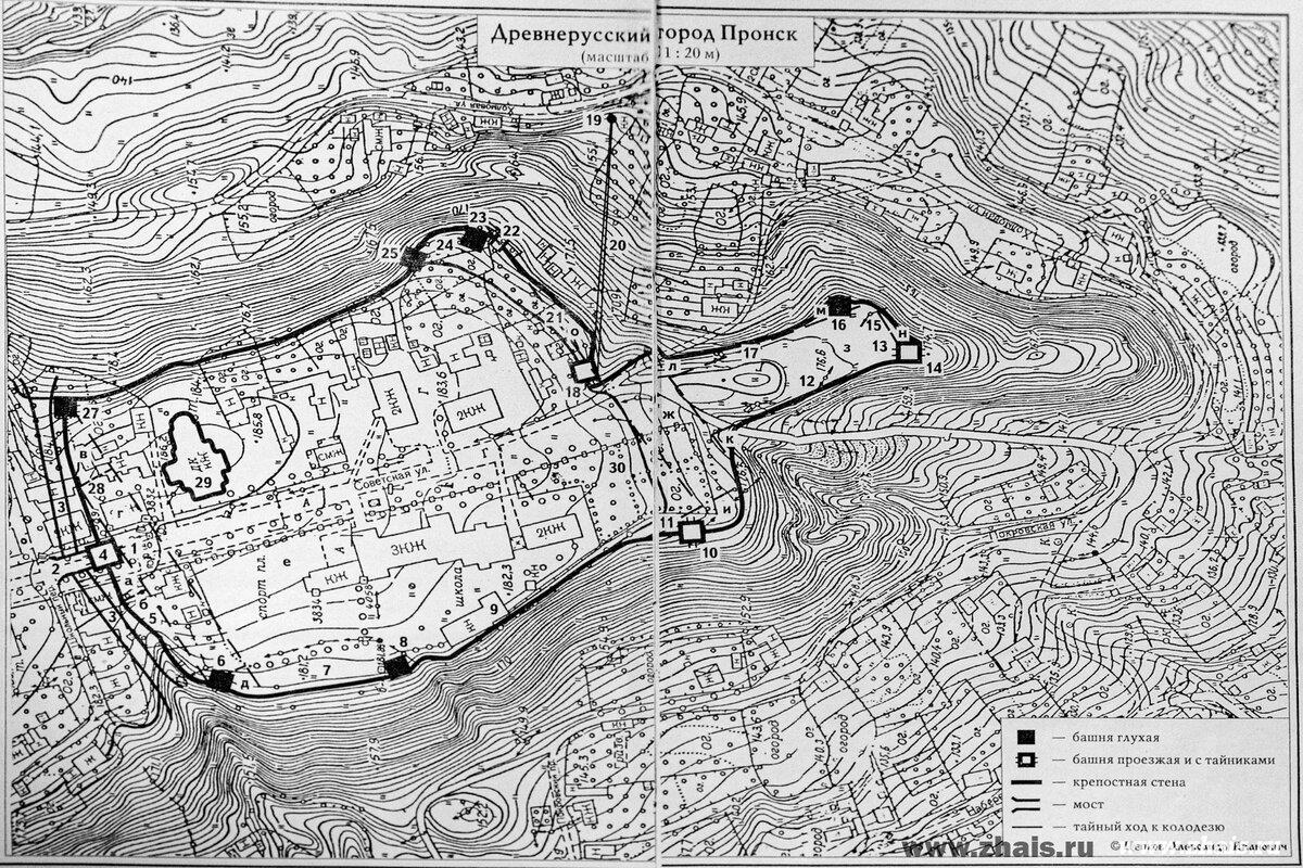 А вот план средневекового детинца и размеры (Судя по остаткам двух рвов, укреплённое поселение, впервые упомянутое в Никоновской летописи под 1131 годом, состояло из двух площадок (300х150—60 м и 300х200 м). Естественной защитой с западной стороны служила река, с других сторон — глубокие овраги, по которым текут ручьи):