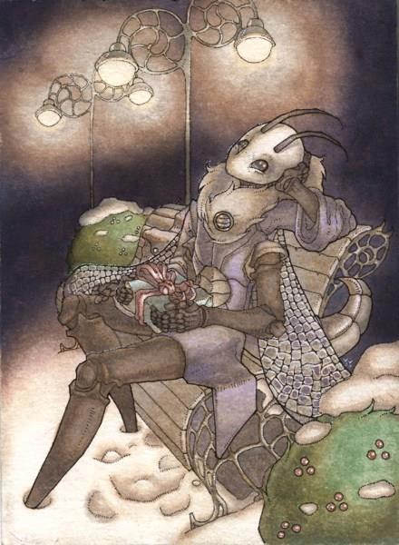 А вот когда их рисует Барбарик, происходит какая-то алхимия. Приглушённые переливы цветов, выразительные жесты, прозрачные опаловые глаза, от которых невозможно отвести взгляд... Эти ребята совсем живые. Они рассказывают истории - мрачноватые и странные. А всё-таки в этих историях есть и теплота, и нежность, и отсвет чуда. Я старомодна - гляжу на печальных жуков, пчёл-воинов и многоглазых изящных пауков, и представляю не игру, а толстую и слегка потрёпанную книгу сказок, которую знаешь наизусть, но снова берёшь в руки, чтобы рассматривать картинки.