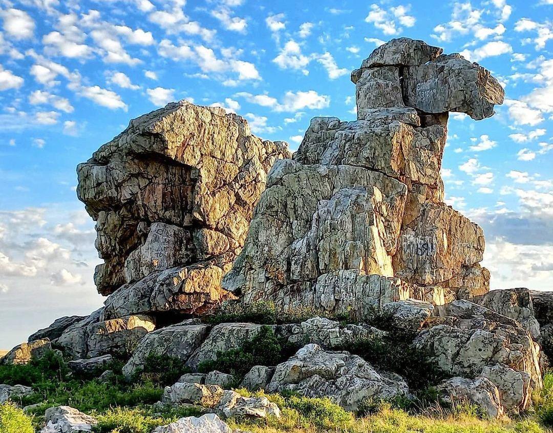 Это Верблюд-гора, две кварцитовые скалы высотой до 14 м, расположенные на левом берегу реки Ащесу в 6 км от её устья в Светлинском районе Оренбургской области.