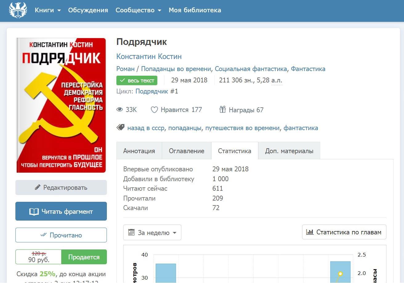 Автор: Константин КостинТем временем одна из моих книг - "Подрядчик", набрала тысячу библиотек!