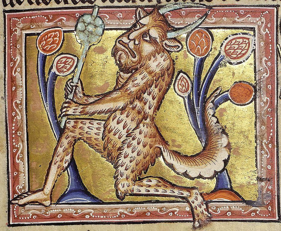 Средневековое изображение сатира из Абердинского бестиария, держащего жезл. Средневековые бестиарии отождествляли сатиров с западноевропейскими дикими людьми.