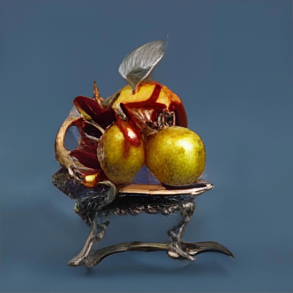 Вот тут я даже не знаю, лучше это или хуже... В прошлый раз с этим образом возникли явные странности, но было ярко и красиво. А тут и блюдечко можно узнать (хотя очень маленькое:)), а яблок даже больше, чем надо, да они еще и золотые вроде как... Но не могу сказать, что этот образ мне нравится. Да и фоном нейросеть, очевидно, не заморачивается)
