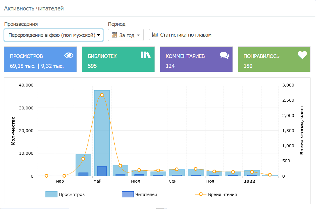 У меня на 07.02.22 у Перерождение в фею (пол мужской) на странице произведения 60к просмотров, а в разделе "Активность читателей" 69к.