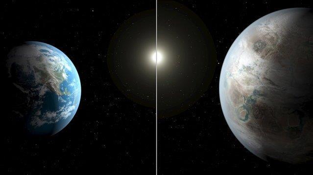 С помощью этой иллюстрации можно сравнить нашу Землю с планетой, находящейся далеко за пределами нашей солнечной системы. Ученые считают ее подобием нашего дома, она на 60% крупнее Земли и расположена на расстоянии примерно 1400 световых лет от нас, в созвездии Лебедя. Это небесное тело назвали Kepler-452b.