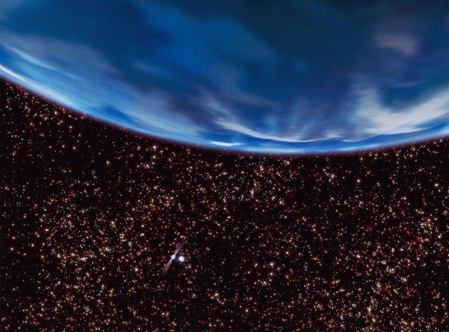 Щедро усыпанное звездами небо наполняет вид с древнего газового гиганта, находящегося в ядре шарового звездного скопления M4. Предположительный возраст этой планеты – 13 миллиардов лет, и она вращается вокруг гелиевой белой карликовой щвезды и миллисекундного пульсара (вращающейся нейтронной звезды с магнитным полем) B1620-26, который виднеется внизу чуть левее центра. Для создания новых планет шаровому звездному скоплению обычно не хватает более тяжелых элементов. Именно поэтому существование такого мира подразумевает более эффективное формирование планет в период стадии ранней Вселенной.