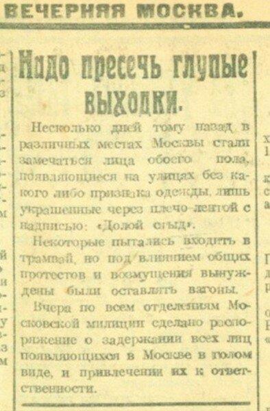 Несколько дней тому назад в различных местах Москвы стали замечаться люди обоего пола, появляющиеся на улицах без какого-либо признака одежды, лишь украшенные через плечо лентой "Долой стыд". Некоторые пытались входить в трамвай, но под влиянием общих протестов и возмущения вынуждены были оставлять вагоны. Вчера по всем отделениям московской милиции сделано распоряжение о задержании всех лиц, появляющихся в Москве в голом виде, и привлечении их к ответственности.