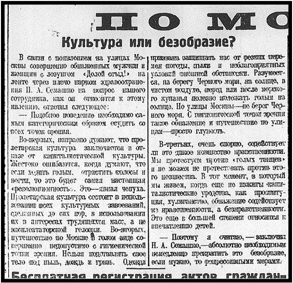 В связи с появлением на улицах Москвы совершенно обнаженных мужчин и женщин с лозунгом «Долой стыд!» на ленте через плечо нарком здравоохранения Н.А. Семашко на вопрос нашего сотрудника, как он относится к этому явлению, ответил следующее: