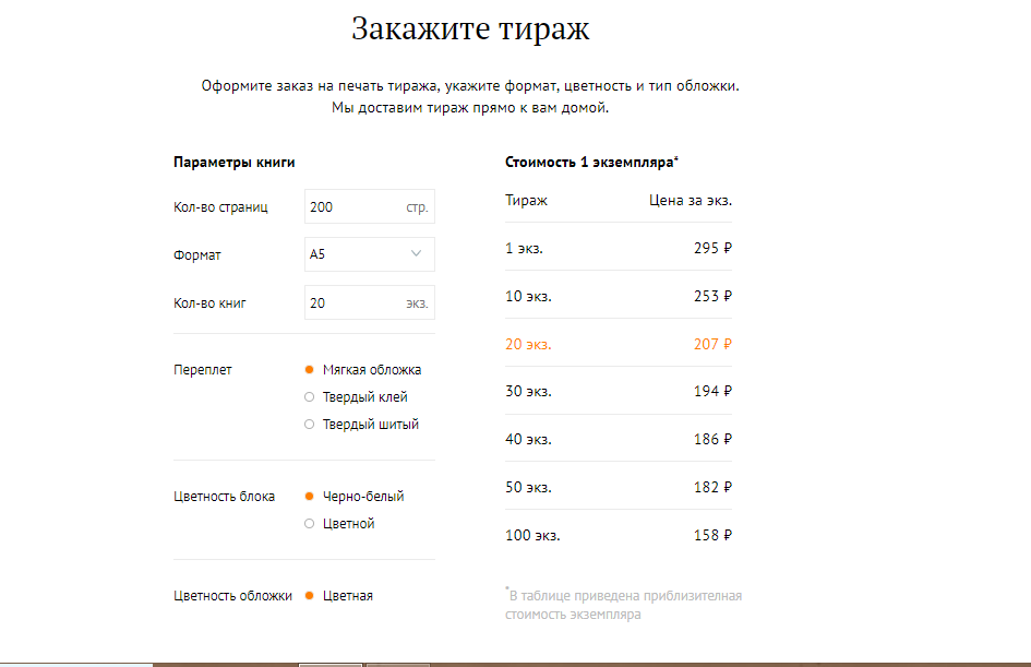 Также на главной странице есть калькулятор, который позволит вам просчитать примерную стоимость одного экземпляра в мягком или твёрдом переплёте. Для меня это было крайне удобно, я живу от зарплаты до зарплаты и мне важно знать, сколько нужно отложить на печать тиража. Стоимость, конечно, приблизительная, то 1000 рублей вы найти сможете, я думаю. Тем более, в печать уходит даже один экземпляр (об этом чуть позже)