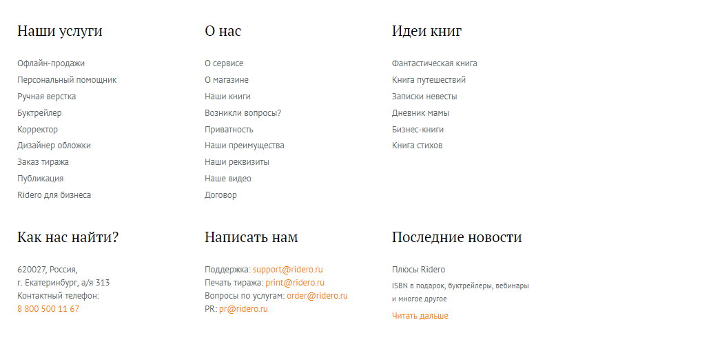 Перейдя вниз, вы сможете увидеть список услуг. Как самиздат-платформа, Ридеро может предлагать услуги, которые понадобятся (или не понадобятся) автору в процессе подготовки книги. Любой каприз за ваши деньги, главное, чтобы вам самим нравилось. Вся нужная информация и е-мейлы, на которые можно послать обращение, вопрос или претензию, если что-то не устроило, находятся так же внизу. Как, впрочем, и идеи для книг разных направлений. Мне они пригодились в своё время, так как я вообще никакая по части дизайна обложек.