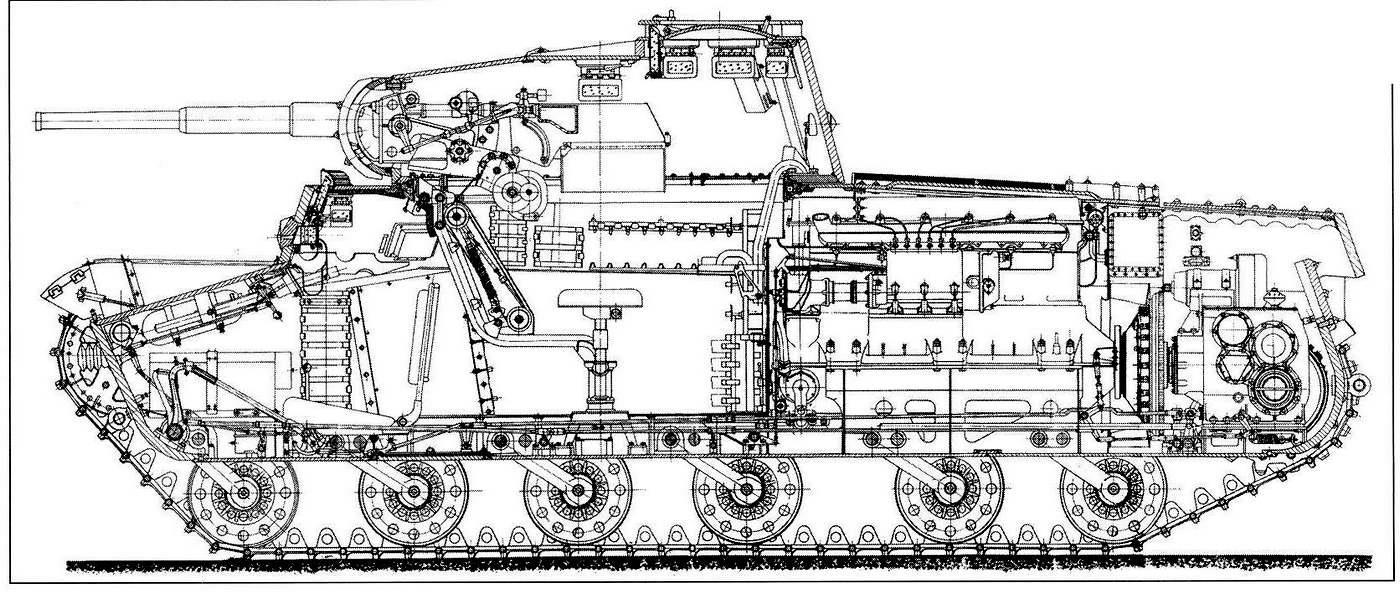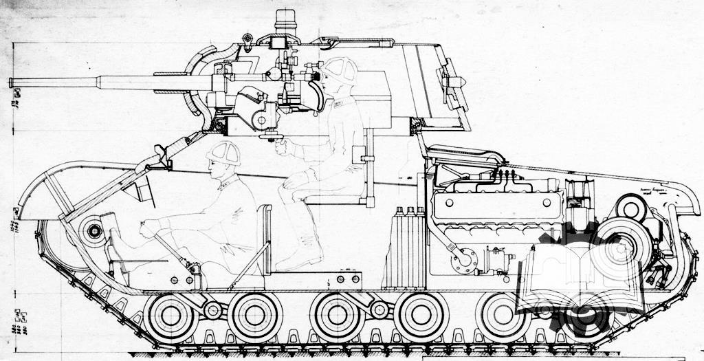 Но дело ведь так просто закончится не могло – это был только первый раунд. Уж не знаю как, но таки вернулись к идее лёгкого танка с противоснарядной бронёй. Уменьшить вес можно было только за счёт толщины брони. Нужно было делать новый проект. Его сейчас знают, как «объект 126» или как Т-126СП. Толщину брони уменьшили до 45 и 20 мм, использовали рациональные углы наклона брони, уменьшили габариты, применили лёгкую торсионную подвеску. Получилось сжато, но 4 человека экипажа там помещались. Тут появились проблемы с броневой сталью, и нарком Тимошенко потребовал увеличить толщину лобовой брони до 55 мм (опять мочало…). Сделали танк в двух вариантах и занялись совершенствованием технологии броневой стали на Мариупольском заводе. Пушка 45 мм, два пулемёта, дизель В-3 мощностью 250 л.с. и горючка на 240 км. Вот чертёж продольного разреза их танка, чтобы Вам видно было, как всё плотно, но всё же помещается: