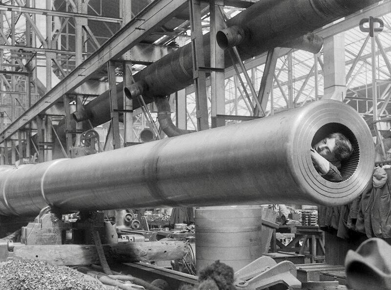 1914-1918 года, Англия, арсенал в Ковентри. работница чистит нарезы 15 дюймового орудия.
