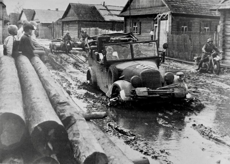 17.07.1941 года, мальчики смотрят на автомобиль Mercedes Benz 170 VK и мотоциклы вермахта, проходящие по улице советской деревни.