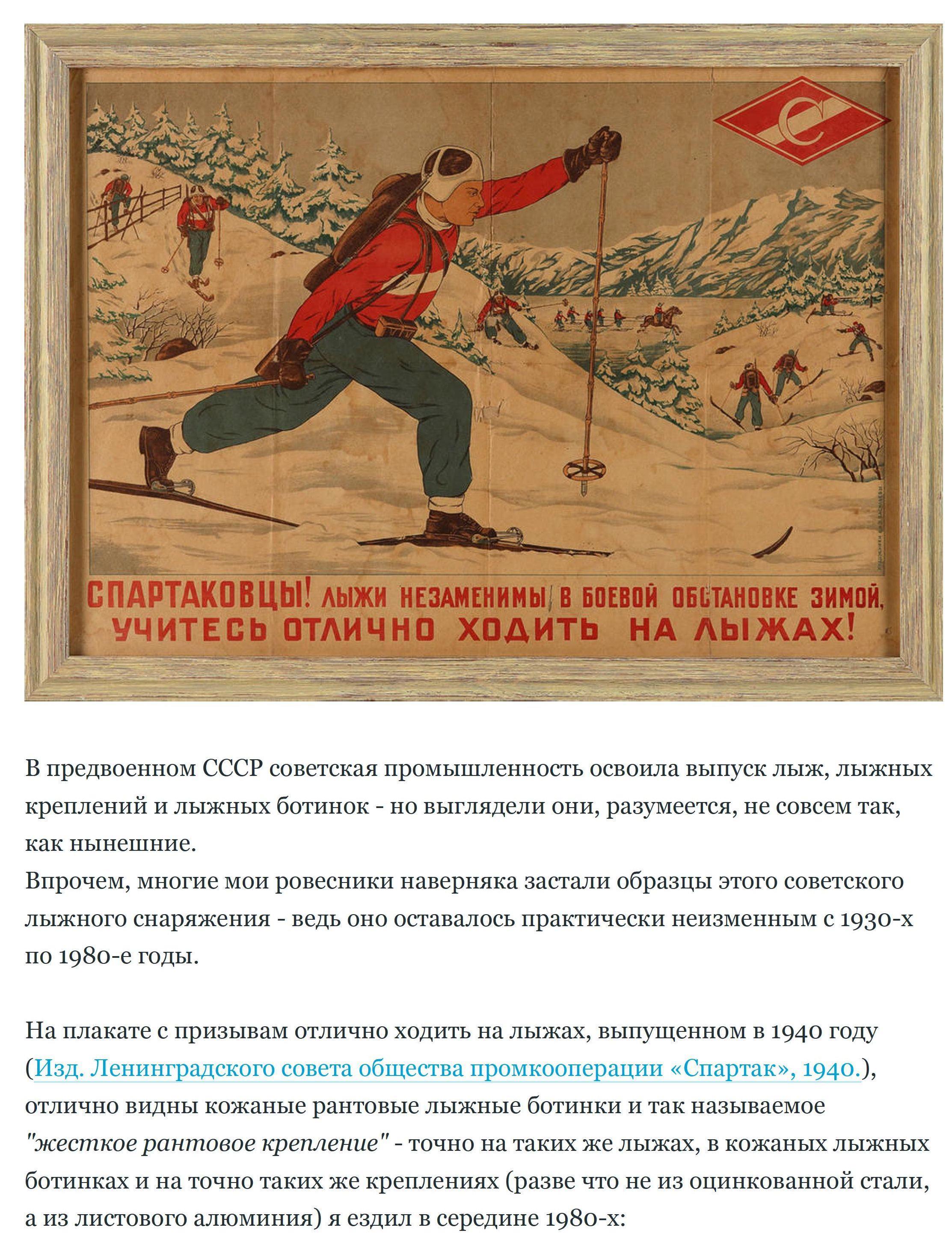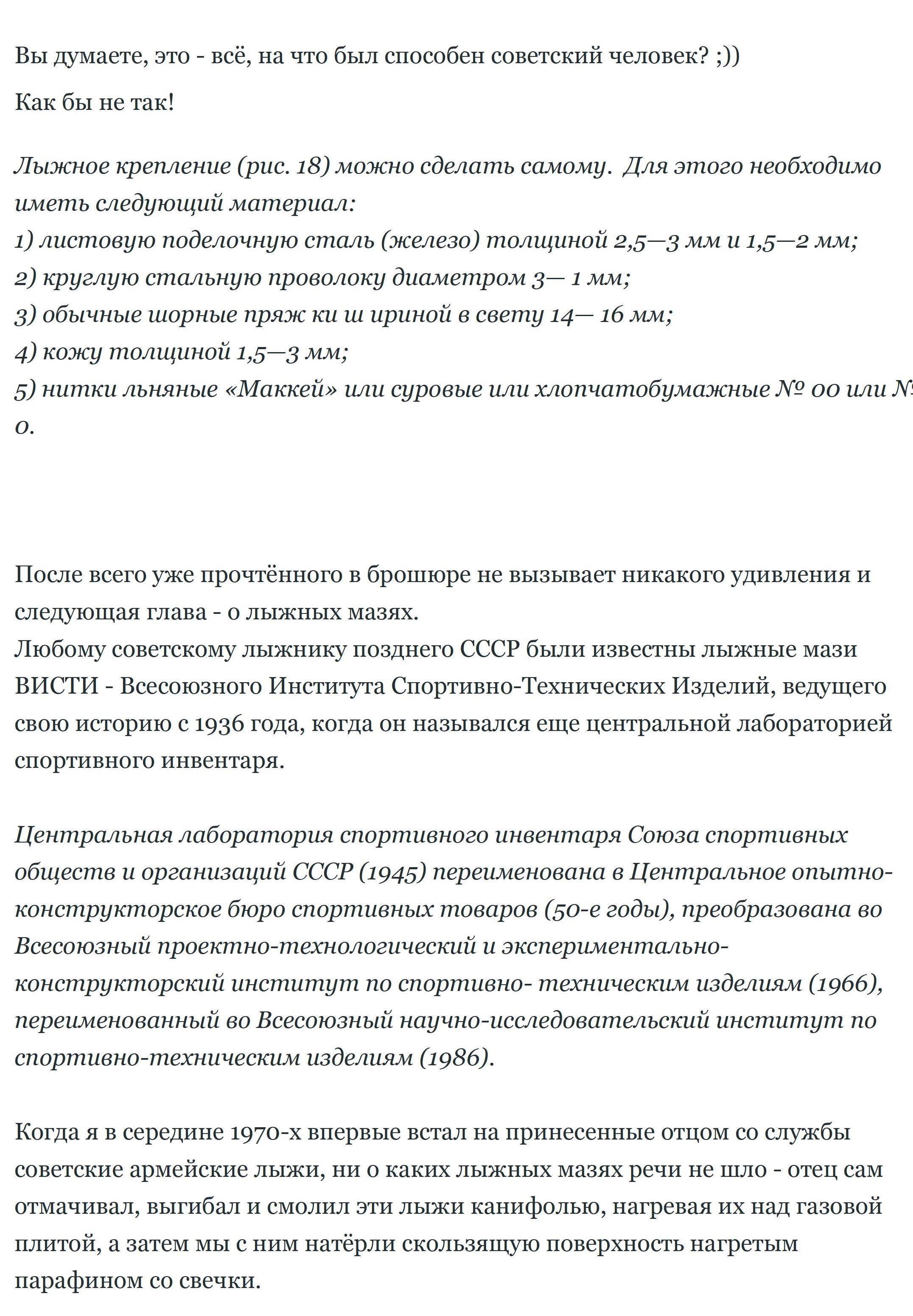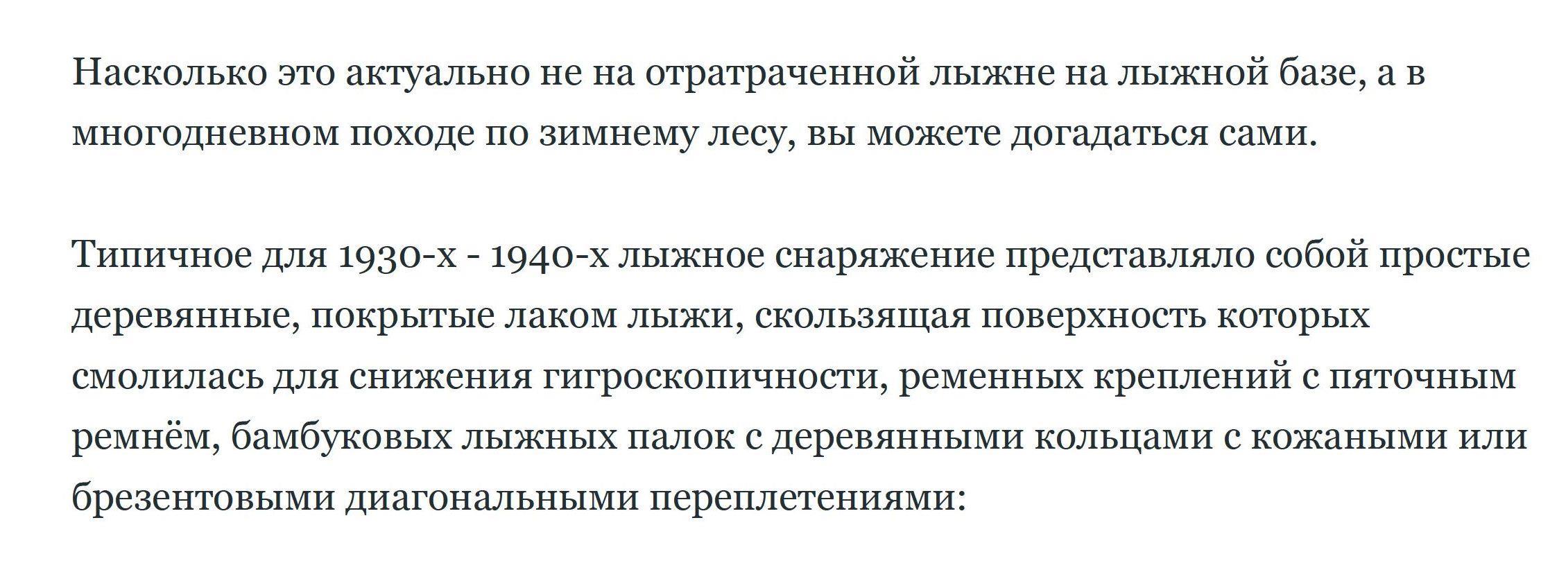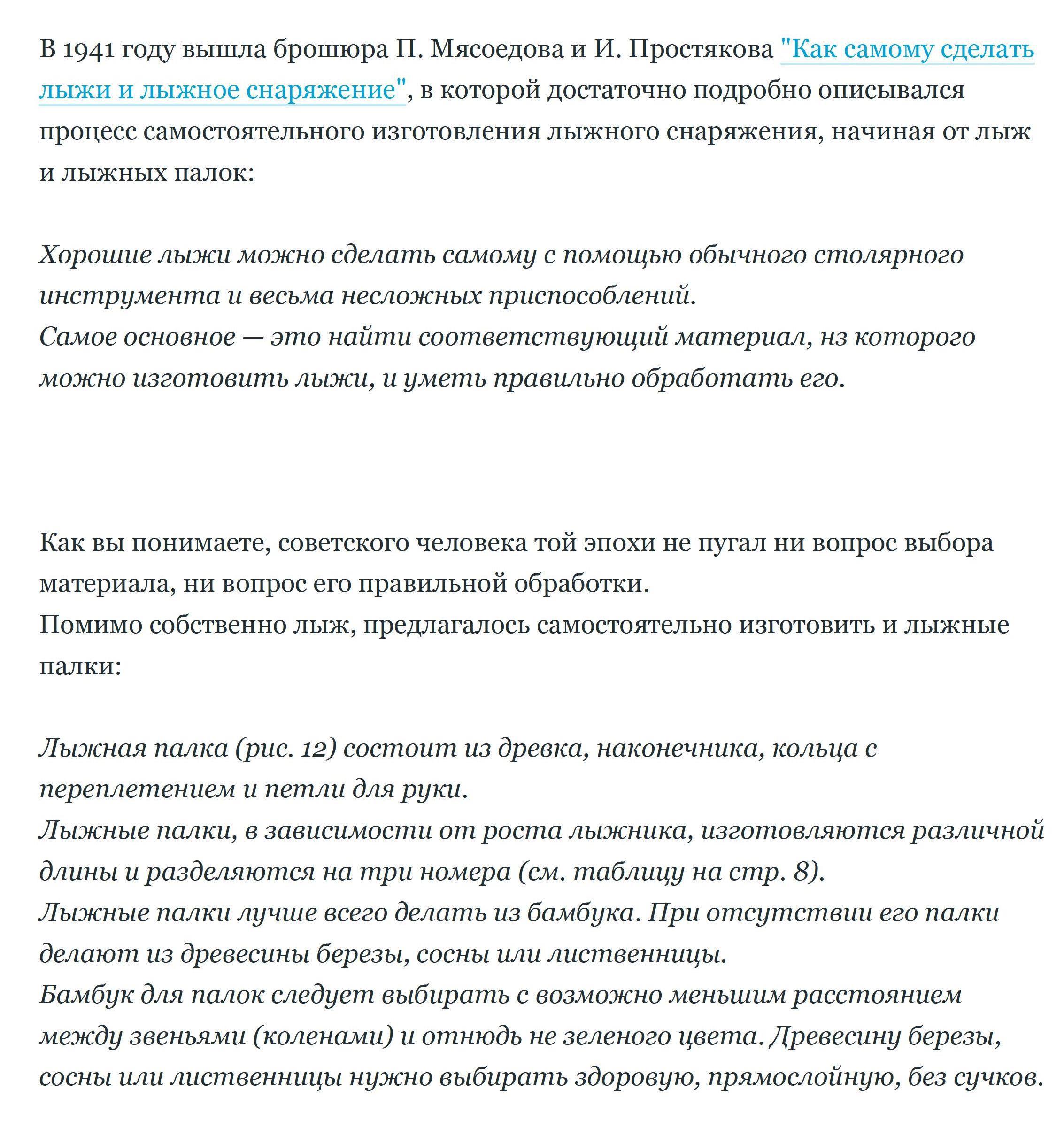 Кстати, и изготовить лыжи, палки, даже крепления и лыжную мазь, каждый мог изготовить самостоятельно. Как? Есть описание этих процессов в интернете, проиллюстрированные страницами из различных документов 1930-1940 —х годов. Подробнее (для желающих) — под спойлером: