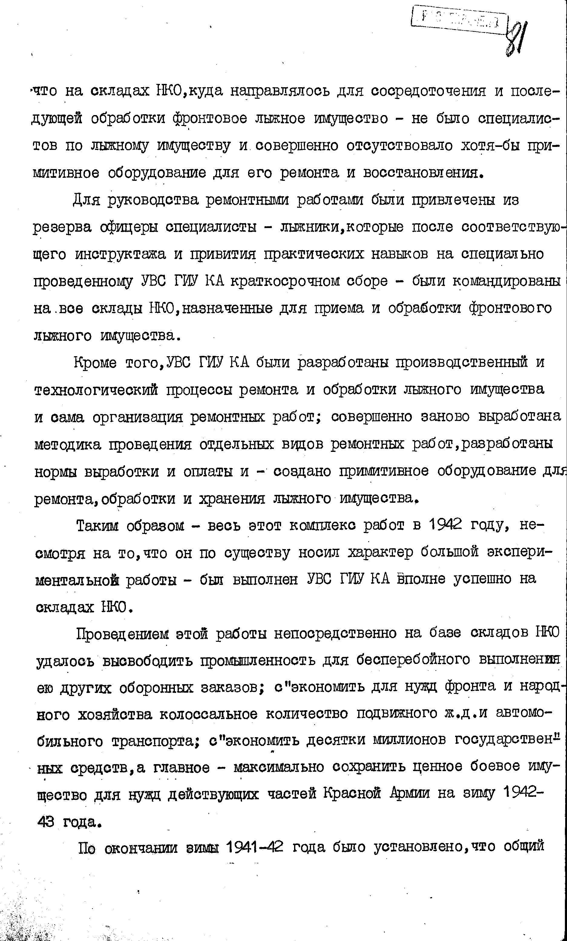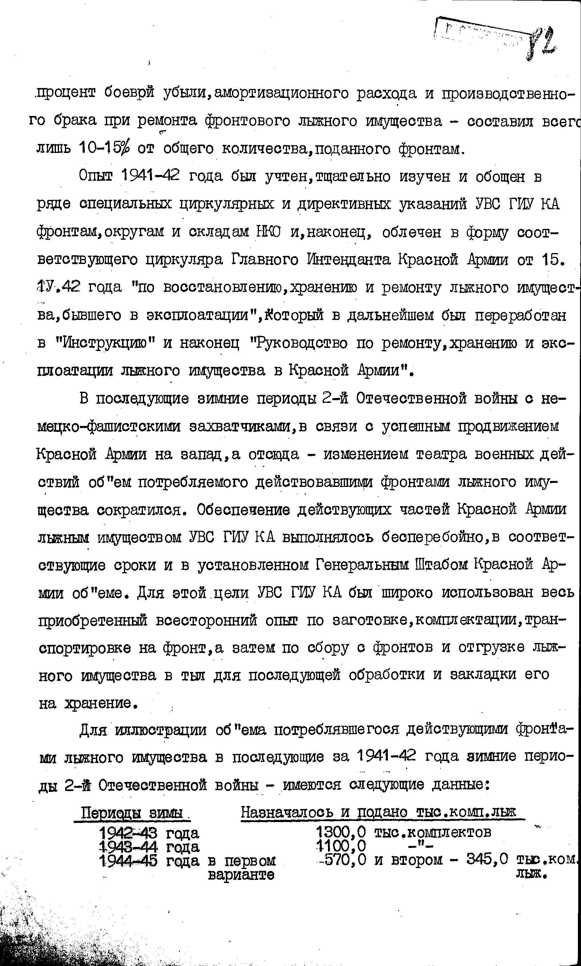 В самый сложный период — зиму 1941 — 1942 годов, в кратчайшие сроки, Красная Армия была обеспечена именно тем имуществом, которое позволило быстро и бесшумно передвигаться по глубокому снегу на большие расстояния, остановить, а затем и отбросить из-под Москвы ненавистного врага.