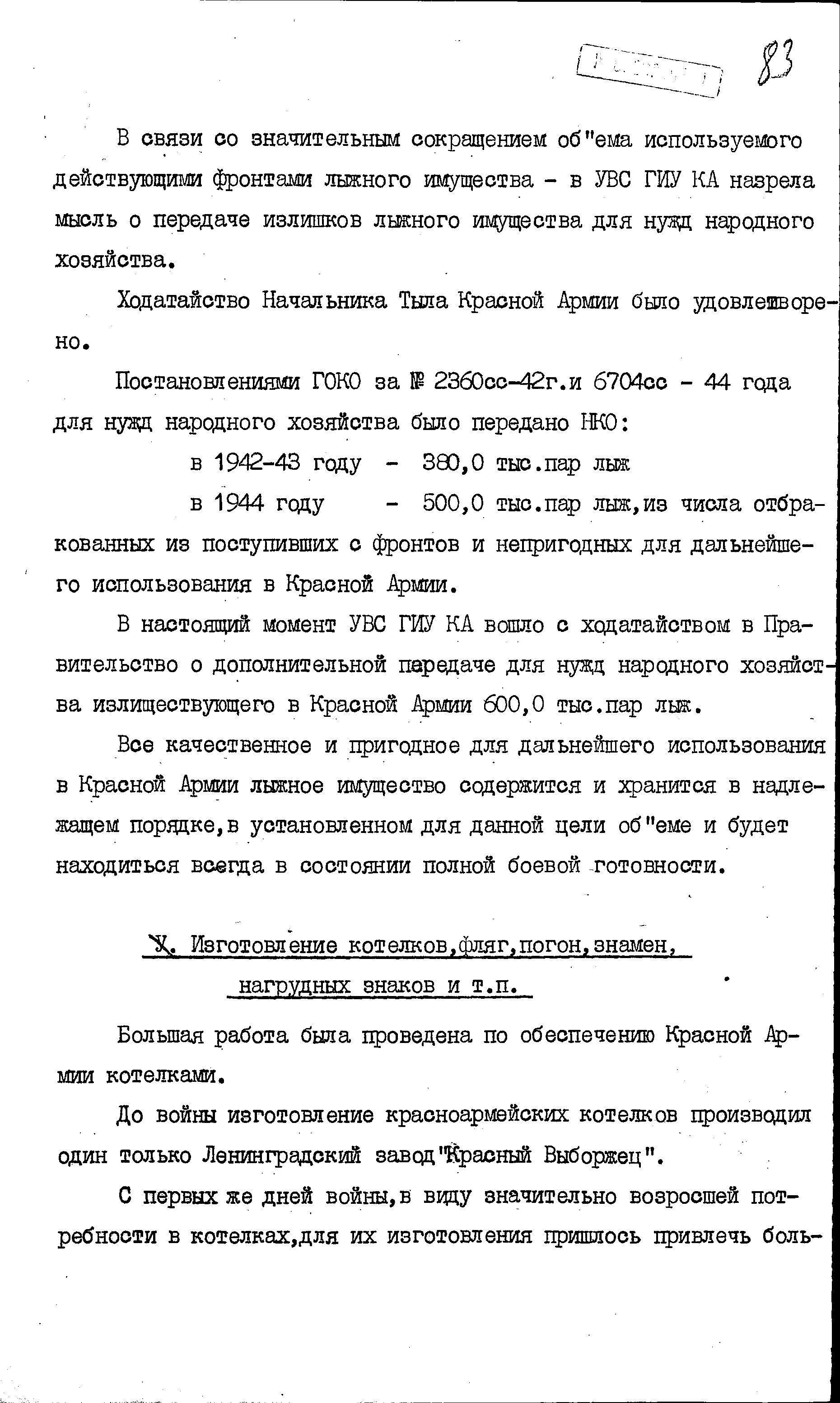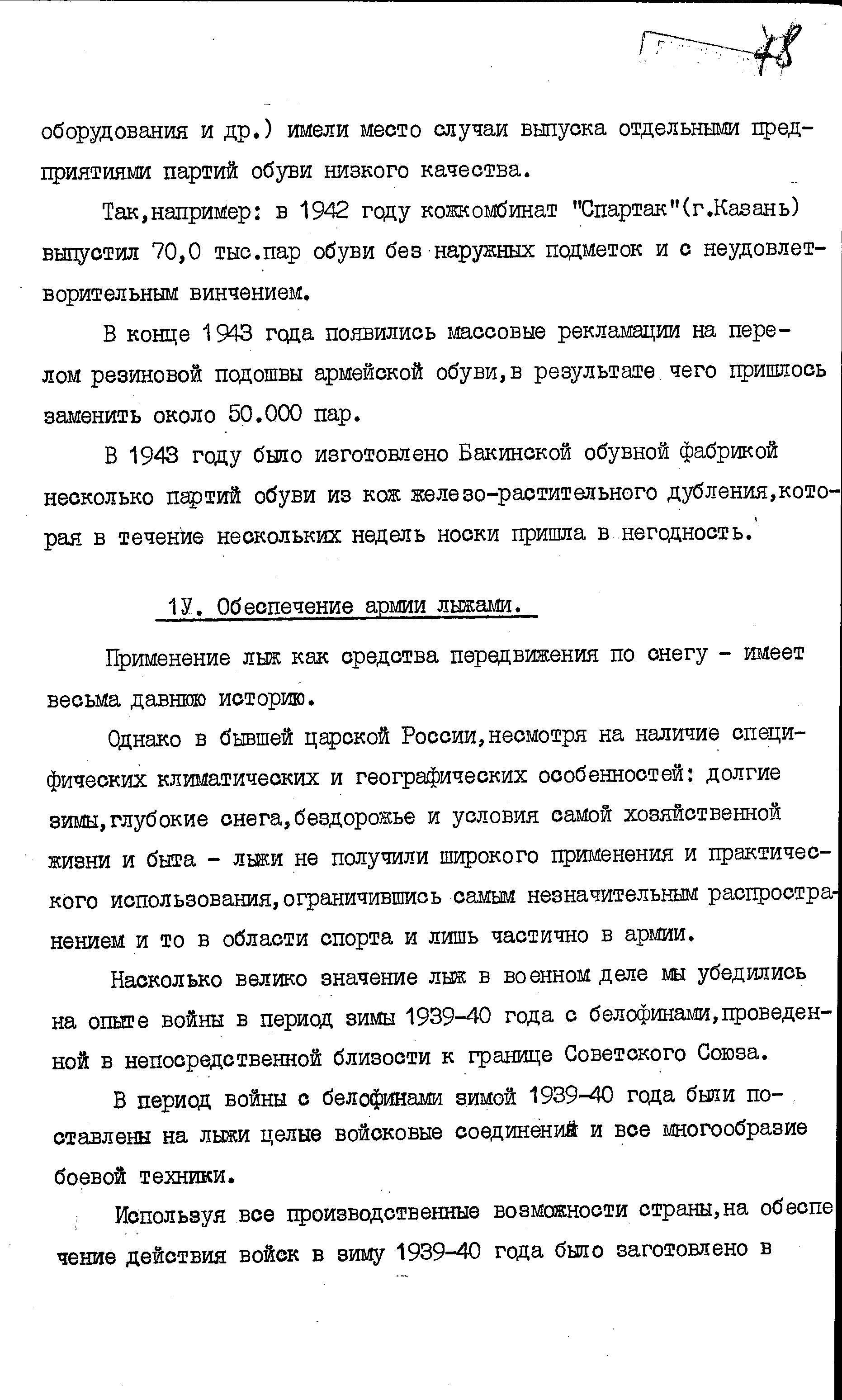 Как видно из документа, и с этим вопросом интенданты справились, как обычно — разумно, экономно, грамотно, привлекая все возможности, используя все ресурсы. В войска шли даже беговые лыжи, которые крепились на специальные лыжные ботинки. Советские граждане сдавали лыжи и в Фонд обороны. И этот душевный порыв также сыграл положительную роль.