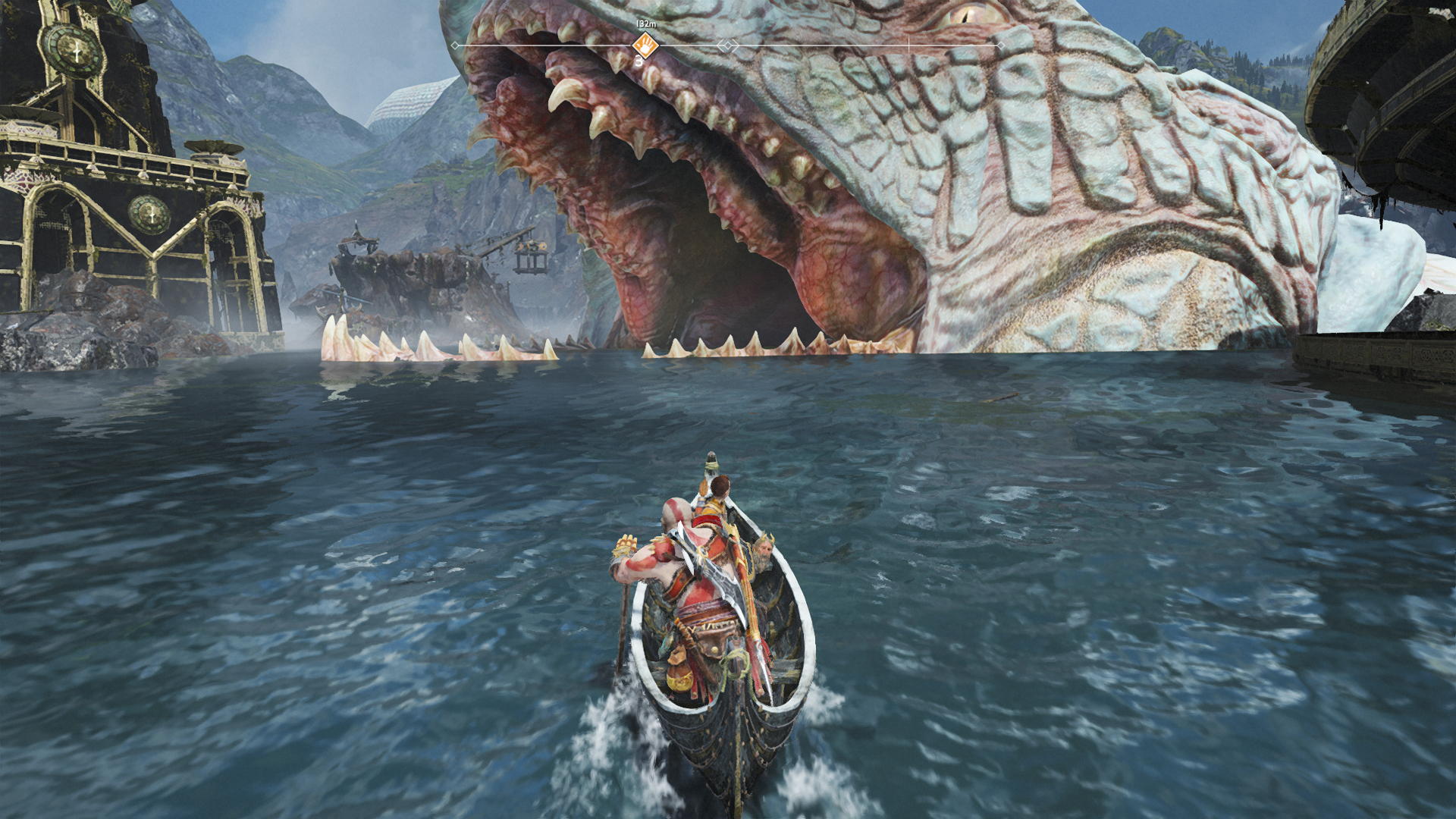Когда, наконец, мне удалось воскресить отрубленную голову, получить нужный предмет и... опять подняться на гору, портал закрылся, потому что на меня напали. Ну и Кратос сыном полетели на самое дно, чтобы оттуда снова вернуться на озеро и найти ещё один способ попасть на вершину горы