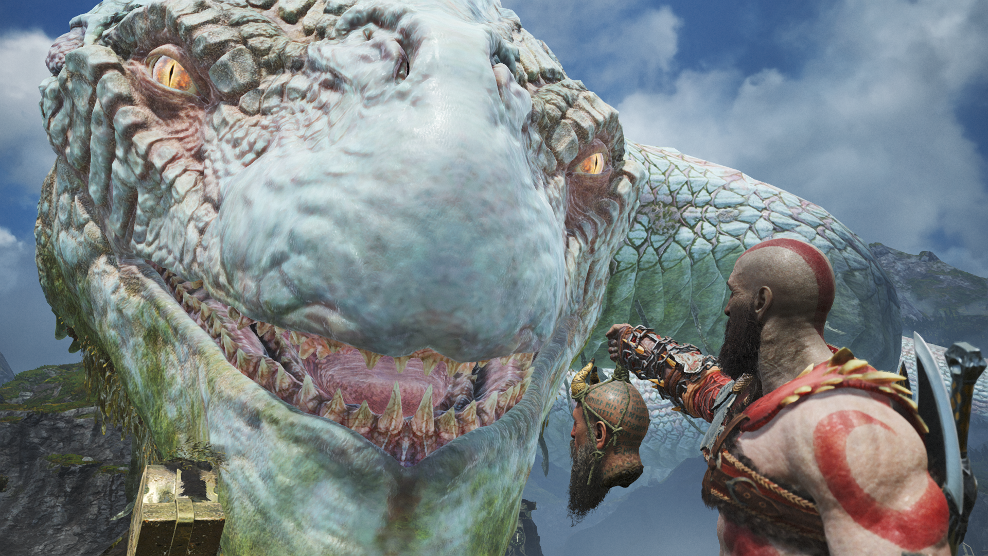 А ещё тут есть огромная змея и отрубленная голова Мимира. Кратос так и обращается к нему. Голова.