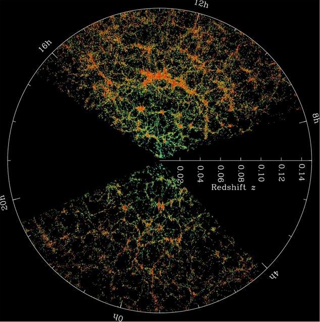 SLOAN DIGITAL SKY SURVEY. Карта локальной Вселенной по данным Sloan Digital Sky Survey. Оранжевые области имеют более высокие плотности скоплений и нитей галактик.