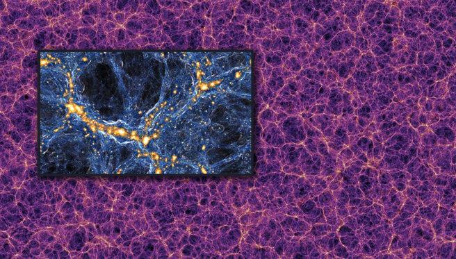 Это — космическая паутина: нити из темной материи в межгалактическом пространстве, которые образуют структуру, вдоль них концентрируется «обычное» вещество. Между нитями находятся огромные космические пустоты. В поперечнике их размер составляет миллионы световых лет. Там почти нет материи. Можно считать, что большая часть нашей Вселенной — это просто ничто.