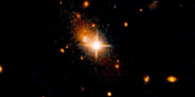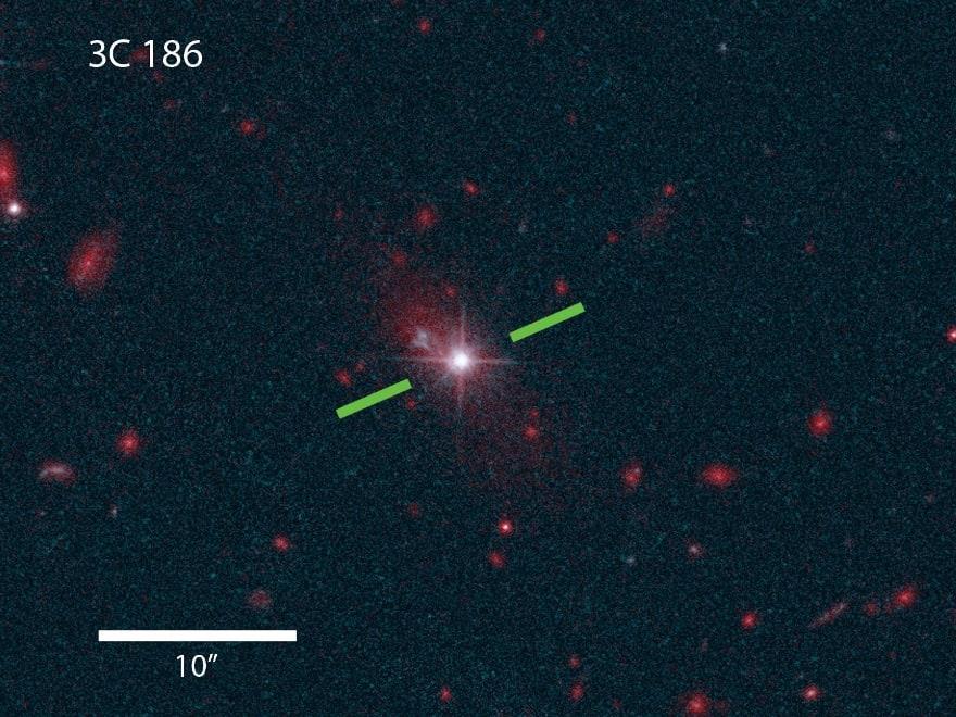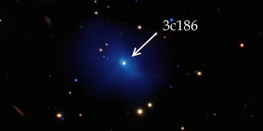 Чёрная дыра 3C 186 с её ярко светящимся аккреционным диском, а позади — покинутая ею галактика.