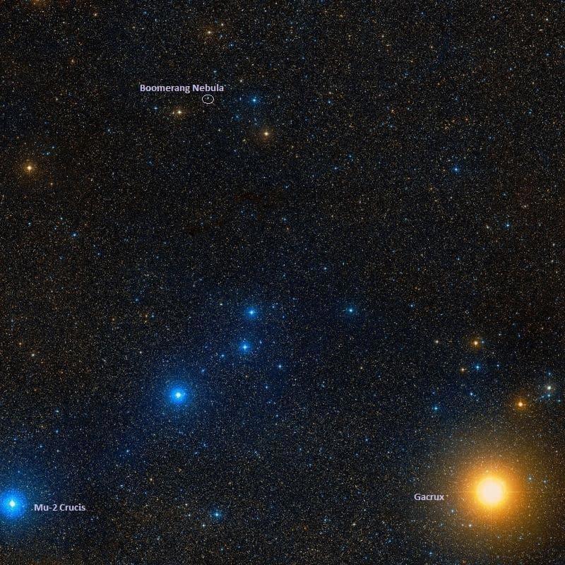 Положение туманности Бумеранг (слева вверху) на звездном небе.