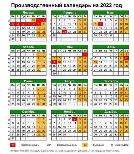 Производственный календарь на 2022 год