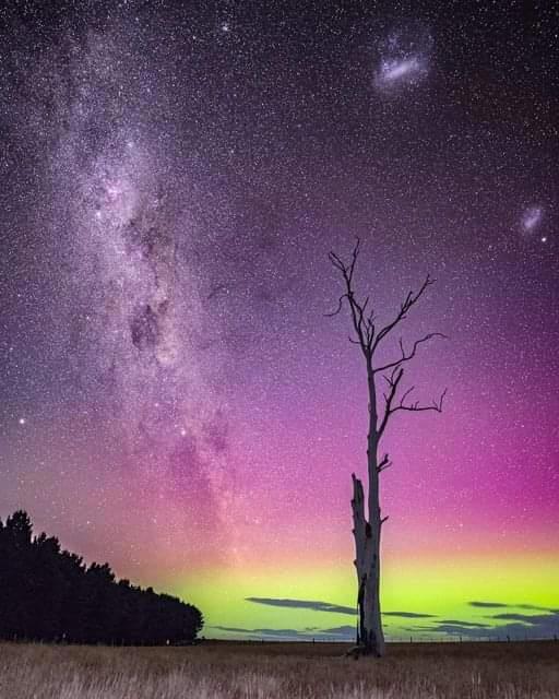 Учебное пособие по астрономии. Выездной класс. Слева Млечный путь. Справа вверху и чуть ниже отчетливо видны Большое и Малое Магелановы Облака а также полярное сияние.