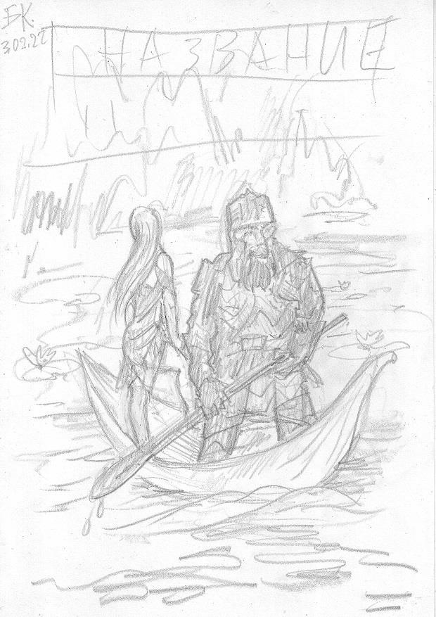 Полное ТЗ выглядело так: гном в закрытых металлических доспехах и чёрной бородой до середины груди, плывёт с дриадой на лодке, сделанной из большого лепестка водяной кувшинки по лесному озеру. Вокруг день, деревья, лёгкий туман.